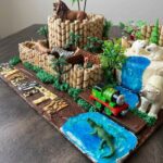 Place your large tiger-striped rectangular cake onto a sturdy board. Smear a little buttercream in the corners to act as a foundation. Stack your zebra-striped rounds on one side to form the lionโ€™s enclosure, and stack your leopard-print cakes on the other side for the polar bears. Use chocolate frosting to cover the ‘ground’ and white buttercream for the ‘ice’ sections. Press your Pirouline cookies and Kit Kat bars into the sides of the cakes to create the fences, making sure they are tucked in securely. Finally, pipe your blue gel to create the alligator pond and place your safari letters across the front of the board to complete the scene.