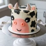 Take one cup of the white buttercream and mix in the melted chocolate, cocoa, and black gel coloring. This will give you a rich, dark frosting for the cow’s spots. Color a small portion of the remaining frosting pink for the snout, and keep the rest white for the main body of the cake.