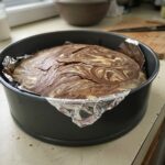 - Pour a layer of vanilla batter into a greased bundt pan, followed by dollops of cocoa batter, then repeat the layers.