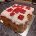Cut the marzipan trimmings into strips and notch them to create that “dripping frosting” look. Press these onto the sides. Finally, cut the red marzipan into squares and adhere them to the top using the reserved frosting as glue in a random pattern.