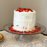 If you have made the simple syrup, brush it lightly over the cooled cake layers. Spread a generous amount of frosting between each layer and over the top, finishing with fresh strawberry slices if you have them on hand.